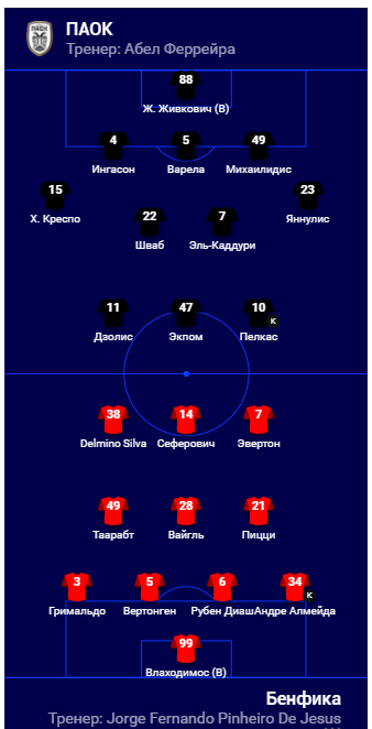 Twitter Во вторник, 15 сентября, пройдет матч 3-го квалификационного раунда Лиги чемпионов. На поле в 21:00 выйдут греческий ПАОК и «Бенфика»из Португалии. Противостояние состоит из одного матча. Игра пройдет в греческом городе Салоники. Стали известны стартовые составы команд. ![]()